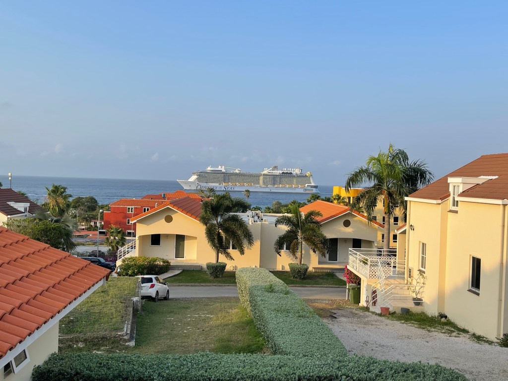 Costa Rica is seeing the worse outbreak of Dengue Fever this year than any before. Since I’ve already spent eight days this year in the hospital with it, I’m passing at the chance for a second round. Could be fatal for me now. Our view from our balcony on the ship.