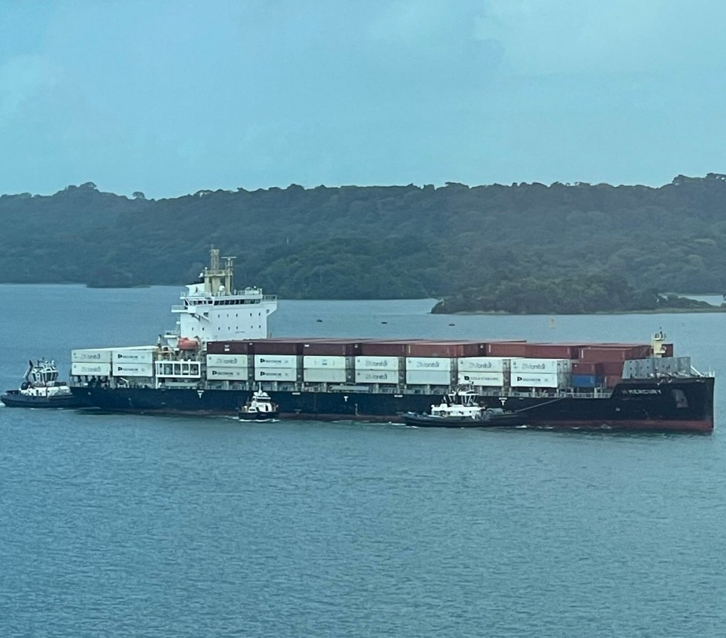 The little trains (called mules) next to the ship help guide them through the canal. Depending on the size of the ship, there are 6 to 8 mules attached at different areas of the ship. I thought those were so clever in the building of this canal.