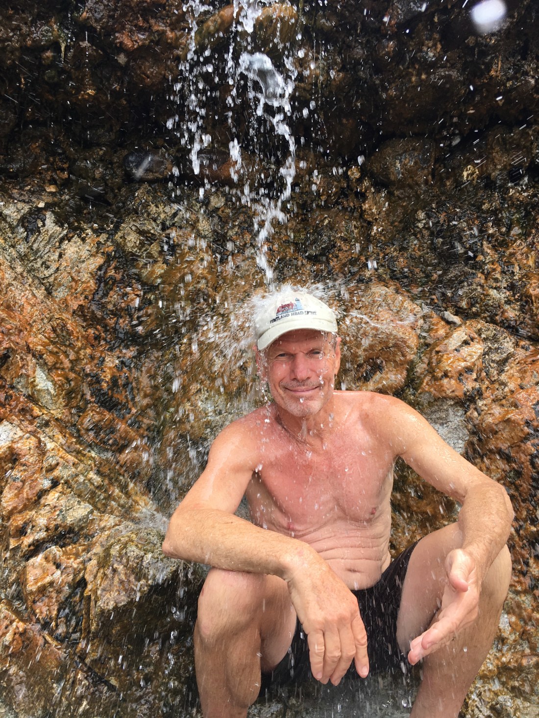 We liked the sign no dogs, no glass, no nudity. Thankful for the no nudity clause. We spent several hours soothing our souls, washing away our stress, and placing ourselves in a state of relaxation soaking in different temperatured pools and cooling off by sticking our feet into the cold river. Oh, the bonus – no cellphone service available. Jay found the perfect temperature shower to hang out under.
